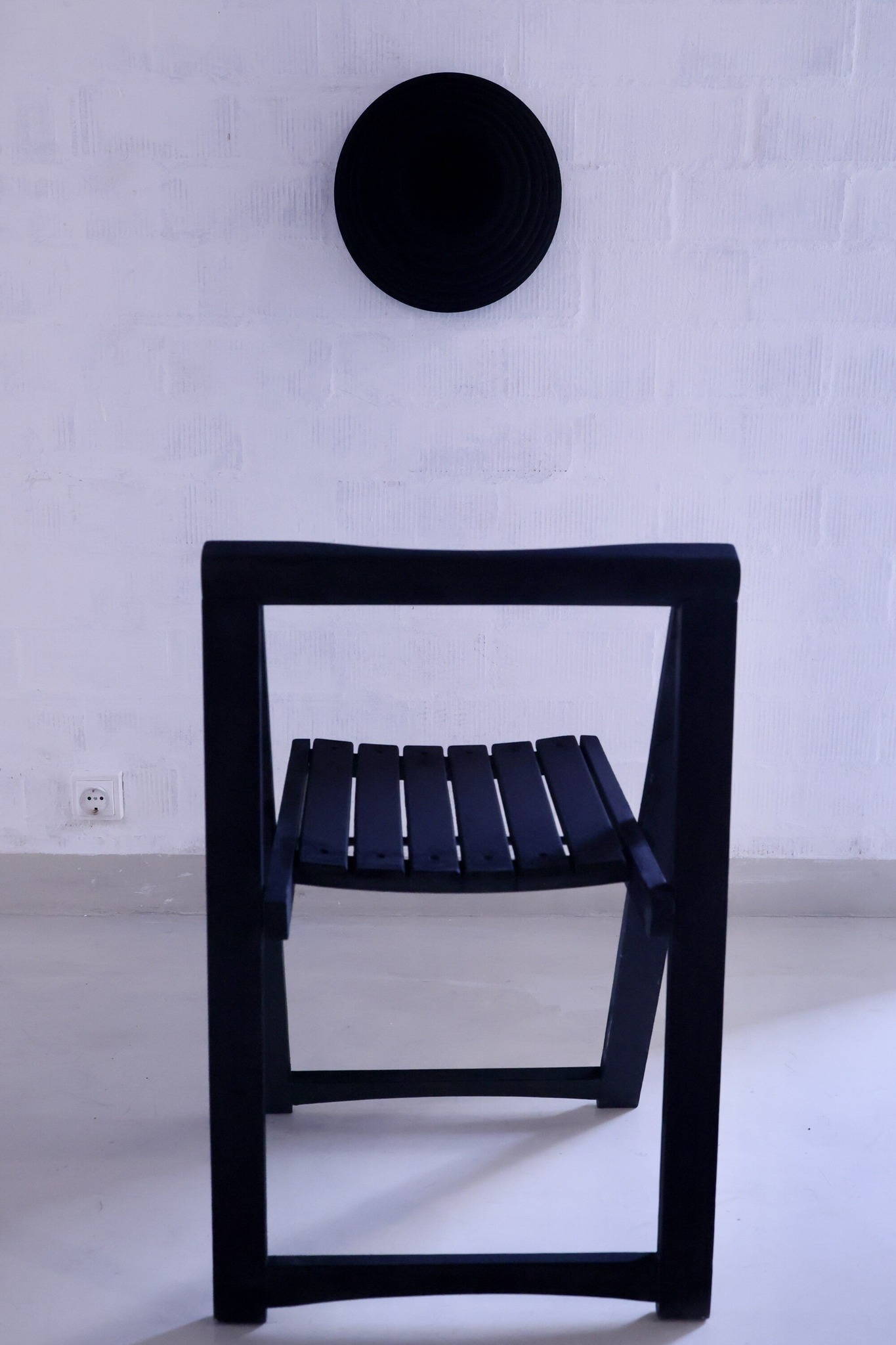 With the applied use of these two media, I try to convey to the audience the experience of a supreme negativity. Regarding this, I pursue an absolute black color, a utopia of perfect absorption of light and shadow, zero dispersion of light toward the eyes, a total matte effect (from the Medieval French word mat, meaning dejected or afflicted), flattening, a total absence of modeling effects, gradients, and shine on objects. Absolute black representing total darkness. Total darkness producing the effect of an exceptional black color.
